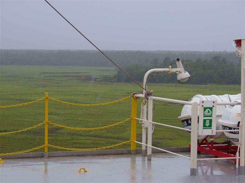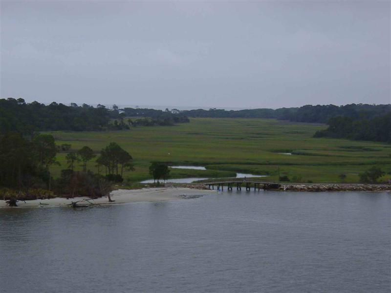 | Seichte Flussmündung in Georgia | Unser Schiff beim Sonntäglichen Laden | Ein so großes Schiff fällt natürlich auf |