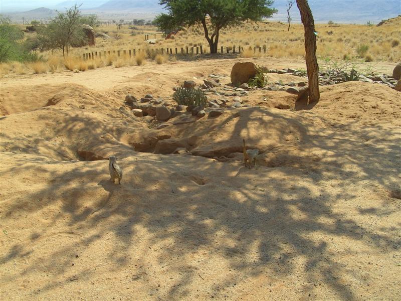 | "Bucan Dune Farm" und Tiere nahe Solitaire | Flory das Erdmännchen | Spielparadies für Flory vor dem Haus |